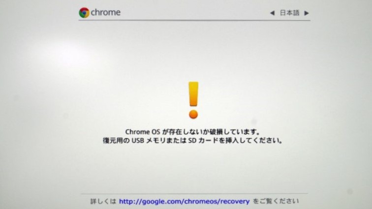 「デバイスに ChromeOS が含まれていません」や「有効なイメージがありません」などの画面が出た場合、間違った Shim を選んだか、デベロッパーモードでないか、書き込みに失敗したか、ファイルが異なるか、壊れているか(続行不可)が考えられます。